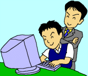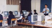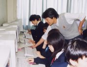 演習で生徒の質問にすぐに答えられるように、40人のクラスをパソコン教室と国際教室の2教室に分け、20人の生徒に対し2人の教師が指導に当たっています。パソコン教室に40台、国際教室に20台の新しいパソコンが設置され、インターネットにCATV回線で常時接続されています。2年間でワープロ、表計算、WWW検索、Eメール、ホームページ作成など盛りだくさんの内容を予定しており、メールアドレスは生徒ひとり1人に配布し、作成したホームページや作品はインターネット上に公開しております。自己表現の場